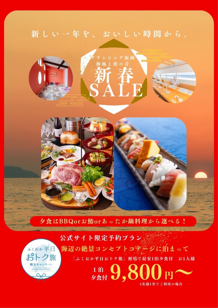 目の前は海!砂浜まで0秒の絶景コテージに泊まって!お部屋であったかBBQを楽しんだり、海が見える鮨カウンターで豪華鮑尽くしコースを味わったり!今だけ!味わえる限定コースの夕食を。
